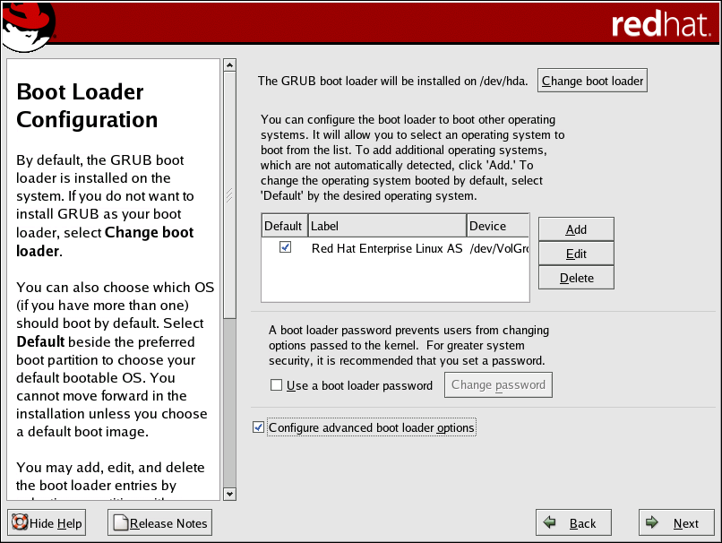 If you choose to use a boot loader password to enhance your system security, be sure to select the checkbox labeled Use a boot loader password.